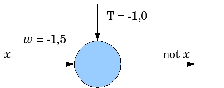 Нейрон с пороговой передаточной функцией может моделировать различные логические функции. Изображения иллюстрируют, каким образом можно, задав веса входных сигналов и порог чувствительности, заставить нейрон выполнять конъюнкцию(логическое «И») и дизъюнкцию(логическое «ИЛИ») над входными сигналами, а также логическое отрицание входного сигнала[19]. Этих трех операций достаточно, чтобы смоделировать абсолютно любую логическую функцию любого числа аргументов.