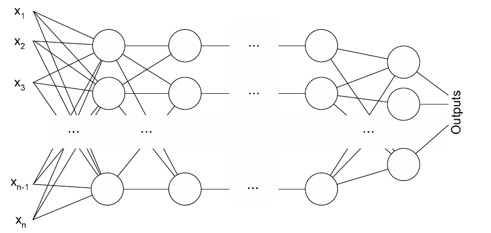 Алгоритм обратного распространения ошибки применяется для многослойного перцептрона. У сети есть входы , выходы Outputs и внутренние узлы. Перенумеруем все узлы (включая входы и выходы) числами от 1 до N. Обозначим через вес, стоящий на ребре, соединяющем i-ый и j-ый узлы, а через — выход i-го узла. Если у нас m тестовых примеров с целевыми значениями выходов , , то функция ошибки, полученная по методу наименьших квадратов, выглядит так: