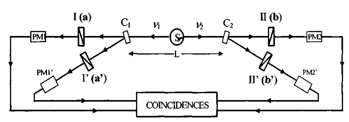 Динамический эксперимент с оптическими переключателями (C1 и C2). Переключатель C, за которым расположены два поляризатора с ориентациями a и a', эквивалентен одному поляризатору, переключаемому между ориентациями a и a'. Переключение происходит примерно через каждые 10 нс. Такая же установка, управляемая независимо от первой, находится и с другой стороны. Расстояние L между переключателями было заведомо достаточным (13 м), чтобы время распространения сигнала между переключателями, отвечающее скорости света (43 нс), было значительно больше, чем пауза между двумя переключениями (около 10 нс) и задержка момента излучения одного фотона пары относительно момента излучения другого (в среднем 5 нс).