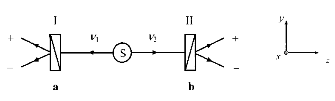 Мысленный эксперимент Эйнштейна-Подольского-Розена-Бома с фотонами. Два фотона v1 и v2, испущенные в состоянии зацепленном состоянии, анализируются линейными поляризаторами с ориентациями a и b. Можно измерять вероятности одиночной или совместной регистрации на выходе каналов поляризаторов