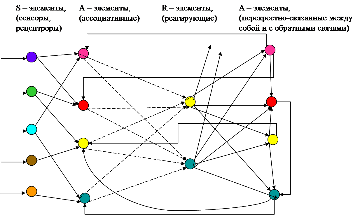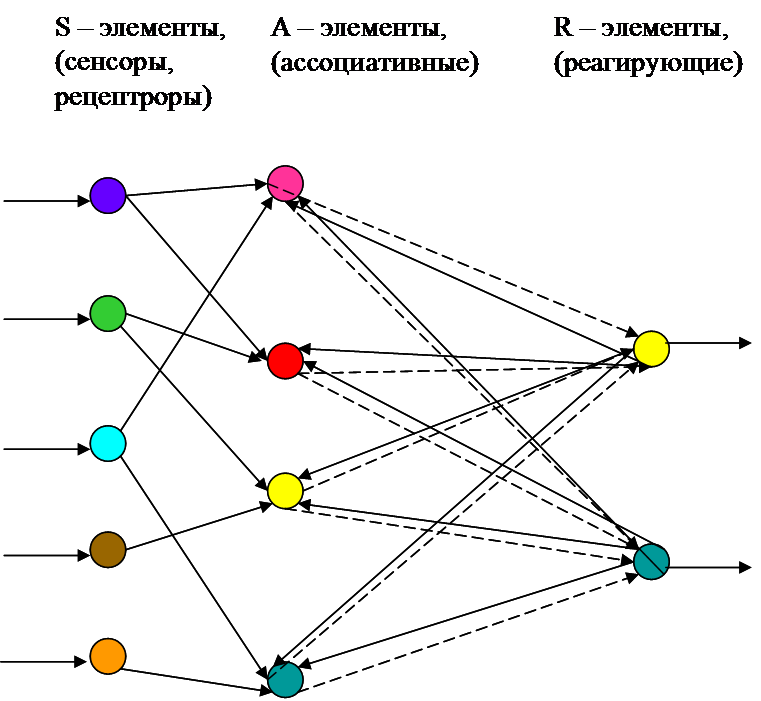 Если к простейшему перцептрону добавить обратную связь с постоянными (неизменяемыми) весовыми коэффициентами от R-элементов к A-элементам, то можно получить простейший вид перцептрона с избирательным вниманием. На рисунке сплошными линиями обозначены связи с постоянными весами, а пунктирными - связи с переменными весами. Обратная связь случайным образом (в равных пропорциях) выбрана с весом +1 (возбуждающая) или с весом -1 (тормозящая). В этом смысле эти обратные связи выбраны так же как и связи от S-элементов к А-элементам, но в отличии от этого первого слоя во втором слое имеются связи от каждого R-элемента к каждому А-элементу. При этом время передачи каждой связи равно фиксированной постоянной , а стимул удерживается на сетчатке в течении времени .