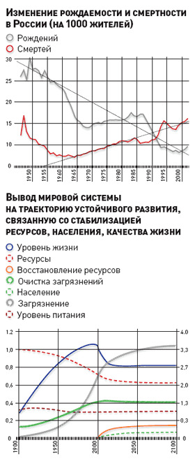 к выводу о катастрофе пришли многие крупные исследователи. Основоположник моделирования мировой динамики Джон Форрестер предсказал коллапс экономики с сокращением населения, резким падением качества жизни, развалом промышленности к 2050 году. Многие исследователи уточняют этот сценарий, но не отвергают его. В кризис неуклонно погружаются все мировые центры силы, и Россия, которая в нынешнем положении зависит от них, не сможет остаться в стороне. В ИПМ им. М.В. Келдыша РАН командой профессора Вячеслава Егорова предложена модель, которая позволяет выйти из кризиса путем создания двух гигантских отраслей промышленности. Одна - переработка отходов, сравнимая по объему с мировым ВПК. Вторая - рекультивация выведенных из оборота земель, сравнимая с мировым транспортным комплексом. Но если за 15 лет отрасли не будут созданы, коллапса мировой экономики не избежать. ... Каждая цивилизация борется за то, чтобы ее ценности воспринимались как общечеловеческие. Ценности России таковы: духовное выше материального, общее выше личного, справедливость выше закона, будущее важнее настоящего и прошлого... Сегодня борьба между цивилизациями идет не только в сфере экономики, но и в сфере ценностей и представлений о будущем.