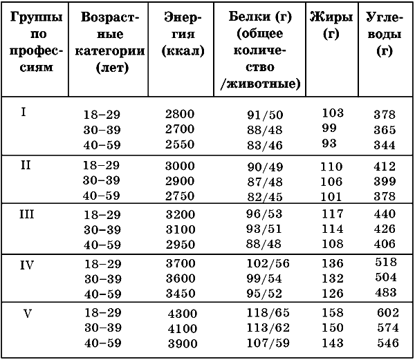 Каждая из групп интенсивности труда разделена на три возрастные категории: 18-29, 30-39 и 40-59 лет. При этом учтено постепенное возрастное снижение энерготрат, что отражается на потребности в энергии и пищевых веществах. Подразделение по полу обусловлено меньшей величиной массы тела и менее интенсивным обменом веществ у женщин по сравнению с мужчинами. Поэтому потребность в энергии и пищевых веществах у женщин всех возрастных и профессиональных групп в среднем на 15% ниже, чем у мужчин. Исключение составляет потребность в железе, которая у женщин детородного возраста выше, чему мужчин. Для женщин не предусмотрена пятая группа интенсивности труда, включающая профессии с особо тяжелой физической работой. При определении потребности в пищевых веществах и энергии для населения в возрасте от 18 до 60 лет в качестве средней идеальной массы тела принято 70 кг для мужчин и 60 кг для женщин. Для лиц с избыточной массой тела потребность в пищевых веществах и энергии определяется индивидуально в соответствии с задачами оздоровительной регуляции массы тела.